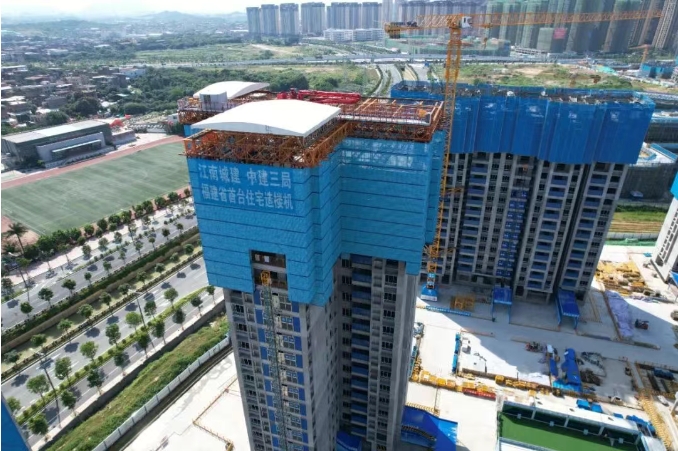 项目积极践行智能建造理念,致力于以科技创新赋能民生工程建设。项目于2024年3月率先在福建省住宅项目中引入智能建造装备——“住宅造楼机”,开创了省内住宅工程智能建造应用的先河。这一创新举措有效突破了传统施工效率瓶颈,助力项目整体施工效率提升约30%,最快建造速度达到“四天一层楼”,为项目提前封顶提供了强有力的技术支撑。