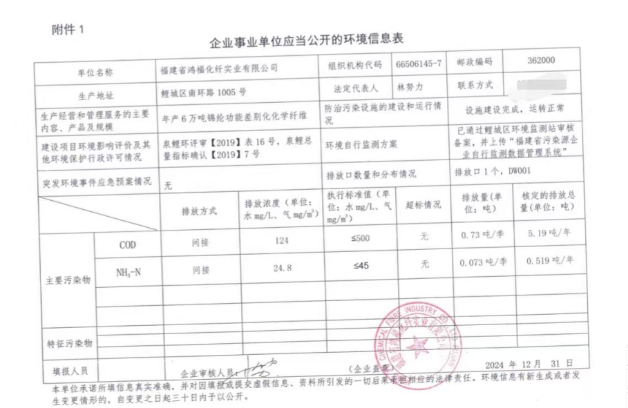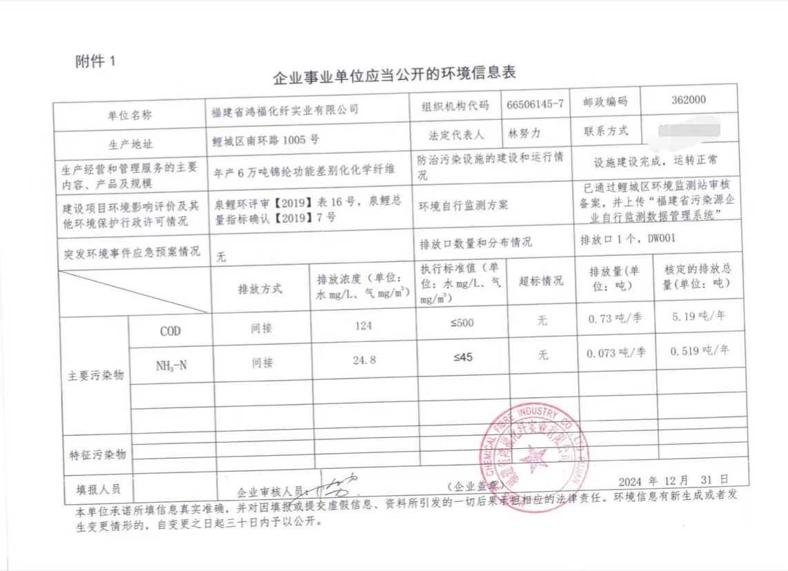 福建省鸿福化纤实业有限公司2024年第4季度环境信息公开表