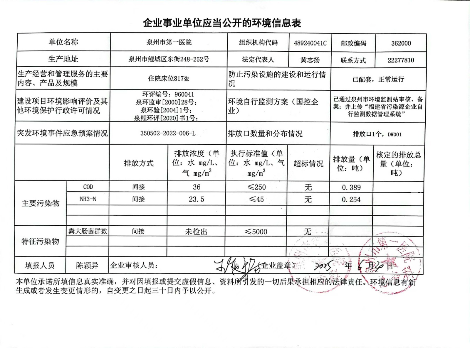 泉州市第一医院2025年第2季度环境信息公开表