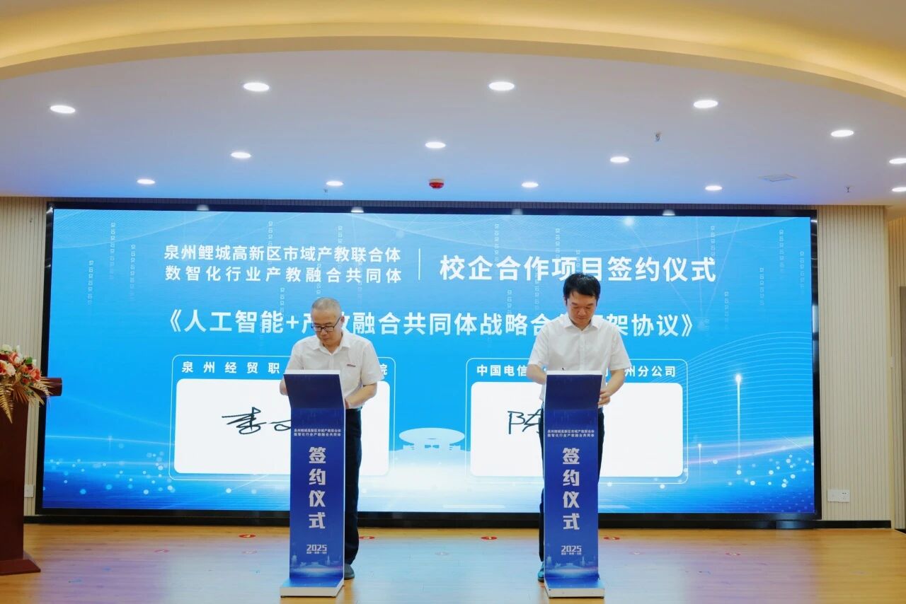 在随后进行的校企合作签约环节,泉州经贸职业技术学院人工智能学院、会计学院分别与中国电信泉州分公司教育行业中心、福建友幸企业管理集团有限公司签署了合作协议。